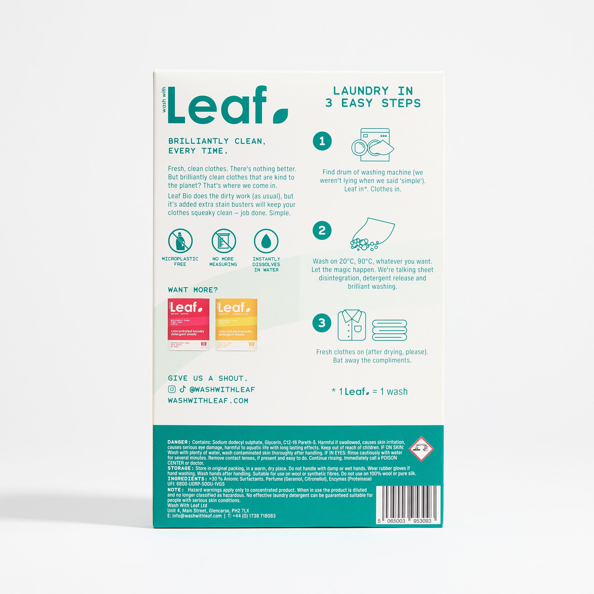 Our bio laundry detergent sheets leave your clothes brilliantly clean, wash after wash. One sheet contains the same amount of detergent as a tablet or cup of powder, with no waste and no mess. One Leaf = 1 wash. Simply put a Leaf in the drum of your machine with your laundry.